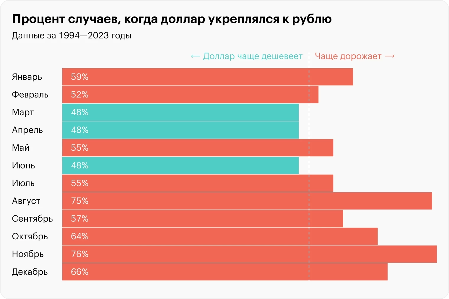 На протяжении с 1994 года, доллар дорожал к рублю в августе в 75% случаев, что составляет 3 случая из 4. Ноябрь также показывает почти такой же результат. Оба этих месяца становятся рекордсменами по числу падений рубля, —
