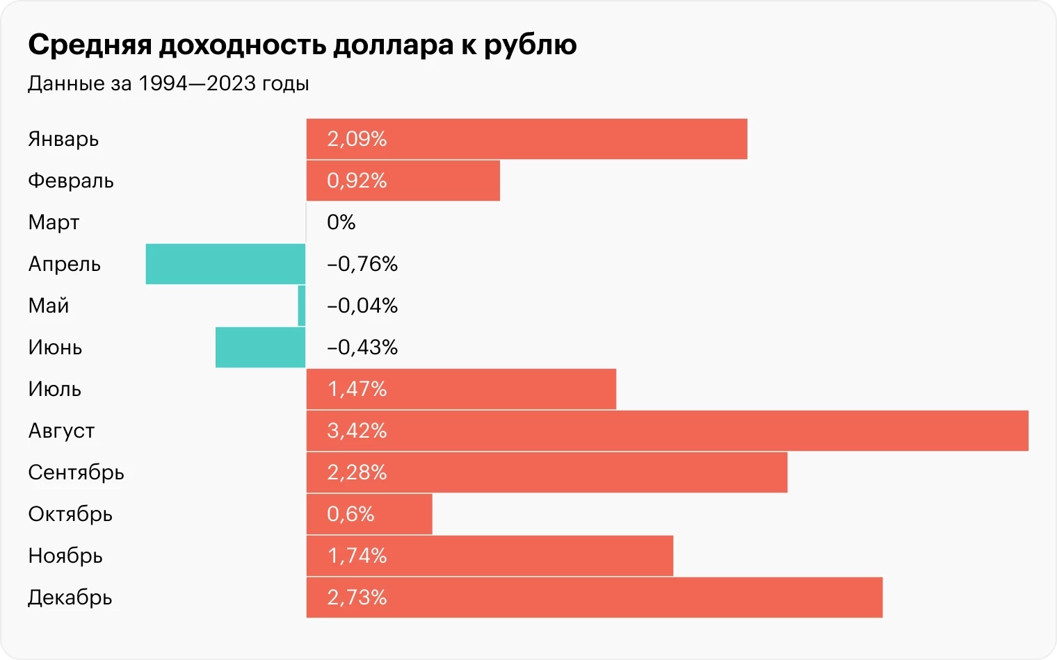 Однако стоит отметить, что 1998 год сильно повлиял на среднее значение в августе. Из-за дефолта в этом году доллар подорожал к рублю аж на 58%, что значительно искажает средние показатели.