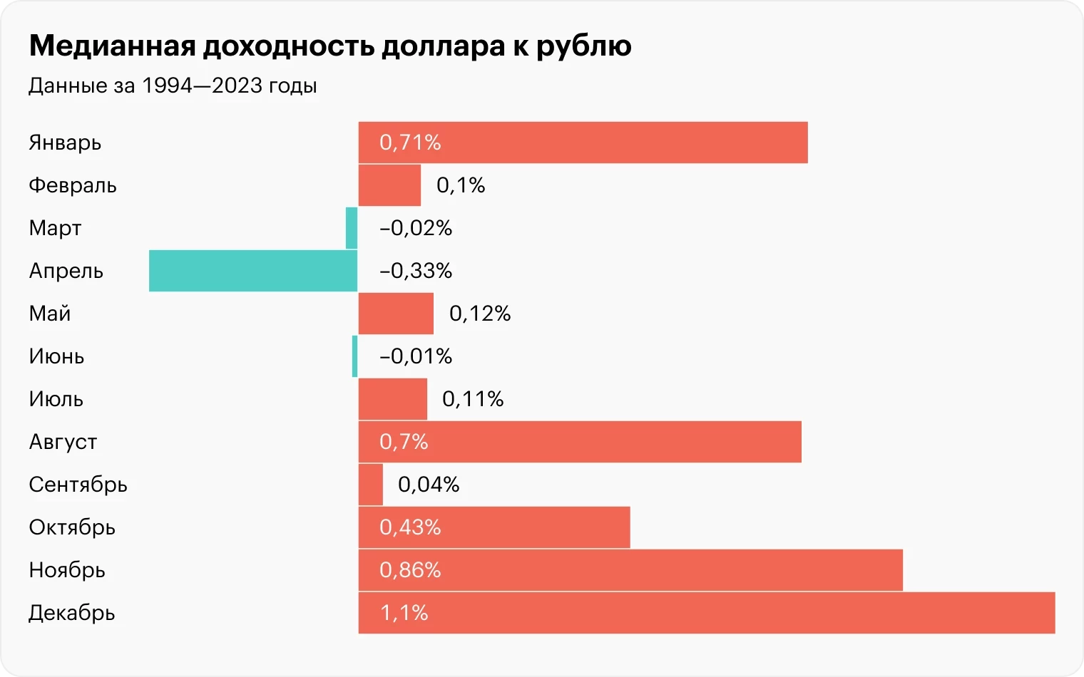 Для более объективной оценки можно обратить внимание на медианное значение. В августе доллар дорожал в среднем на 0,7%, что также делает его одним из худших месяцев, но не самым худшим. Апрель, напротив, остается лучшим месяцем по медиане, так как в этот период рубль чаще всего и сильнее всего укреплялся за все изучаемые годы.