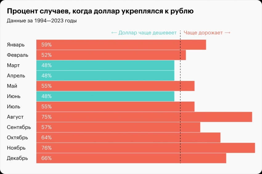 С другой стороны, доллар укреплялся реже всего в марте, апреле и июне — «всего» в 48% случаев, что говорит о том, что в этих месяцах российская и американская валюты практически находятся в паритете, — передаёт pronedra.ru.