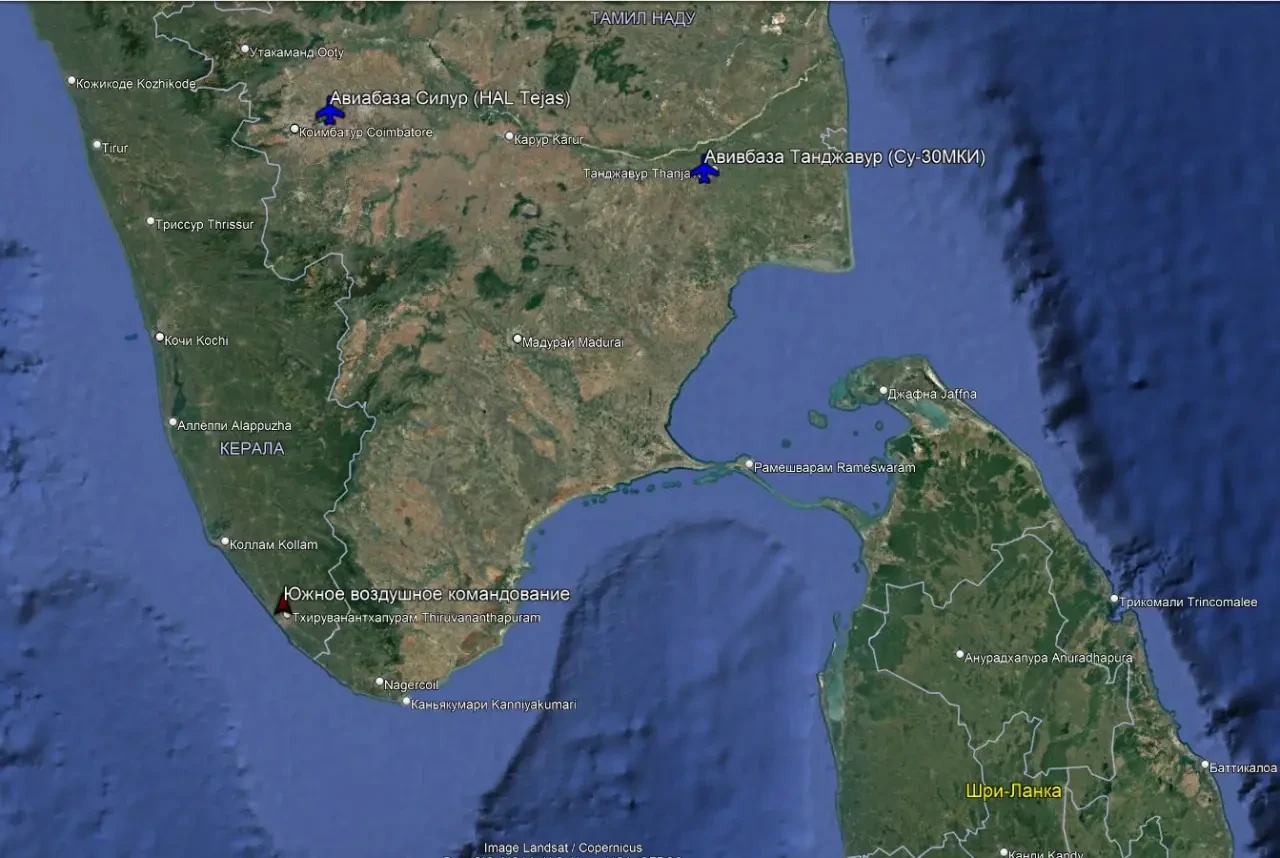 Схема дислокации истребительных эскадрилий Южного воздушного командования ВВС Индии