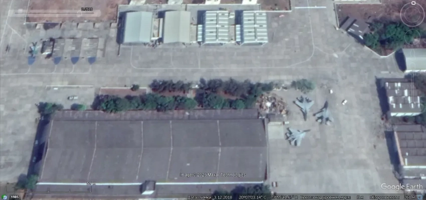 Спутниковый снимок Google Earth: истребители Су-30МКИ на авиабазе Юго-Западного воздушного командования Джодхпур. Снимок сделан в феврале 2025 года