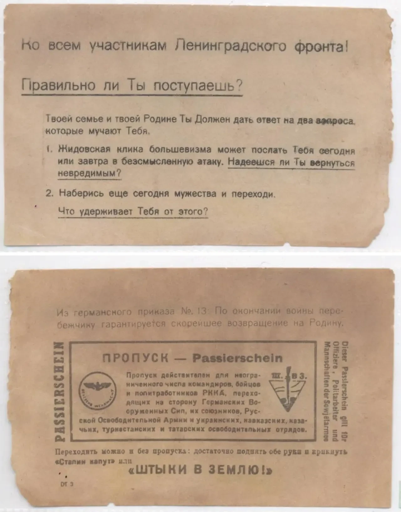 Полный текст несуществующего приказа № 13. Этот ложный приказ был создан только для того, чтобы попытаться искоренить у советских солдат страх перед немецким пленом