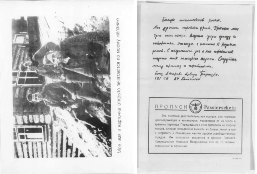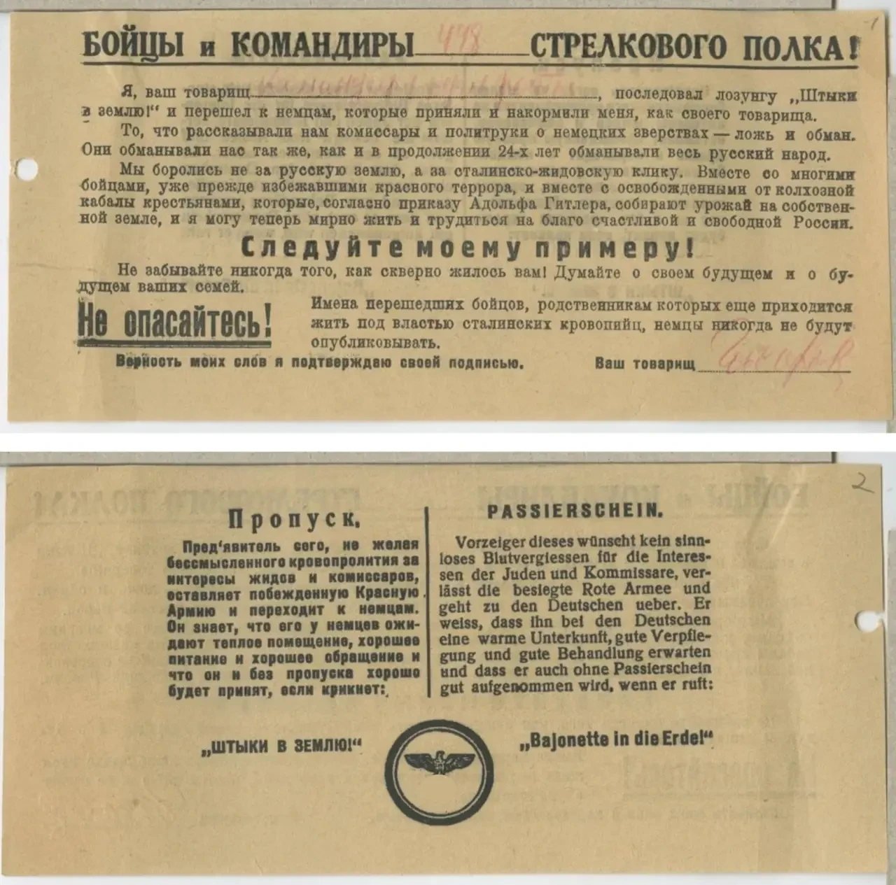 Листовка-шаблон, куда можно было вписать нужный номер полка, имя и подпись как подтверждение написанного. Данные могли вписывать сами немцы, умеющие писать по-русски