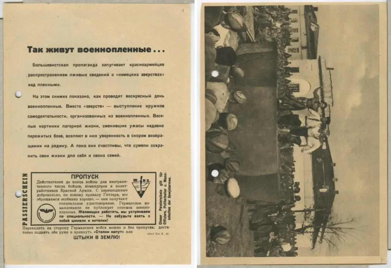 Фашисты понимали, что для того, чтобы советские солдаты начали сдаваться в плен, необходимо пообещать им то, в чём они в первую очередь нуждались. В первую очередь это уход от войны, вкусную еду и тёплое жильё. Для этих целей было создано огромное количество листовок, показывающих хорошую жизнь в немецком плену. На большинство подобных листовок помещались фотографии советских бойцов, якобы уже перешедших в плен. На фотографиях изображалось, как солдаты едят вкусную еду, работают по специальности, отдыхают, играют в карты, участвуют в праздничных мероприятиях в лагерях и прочее.