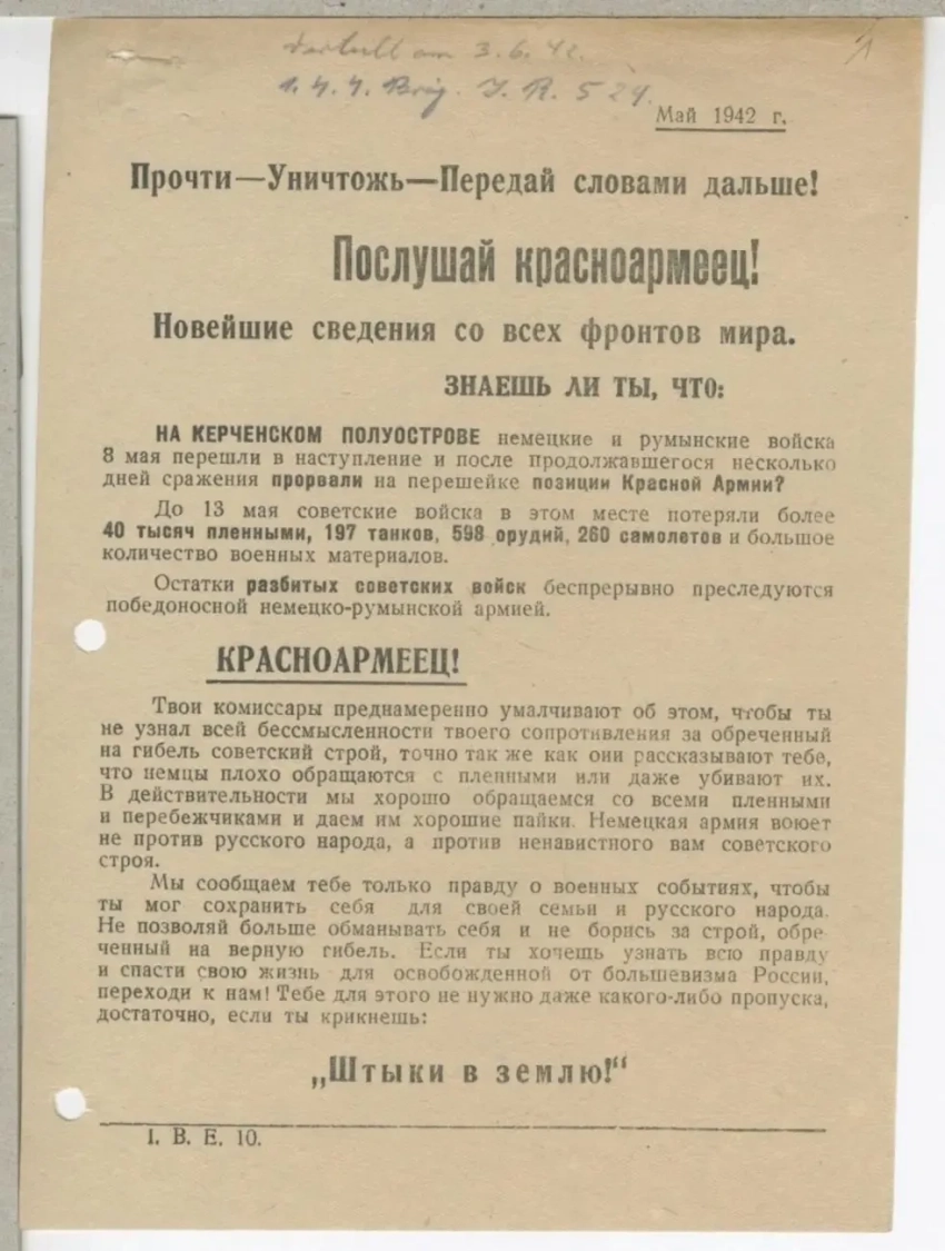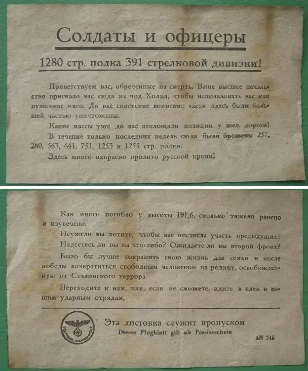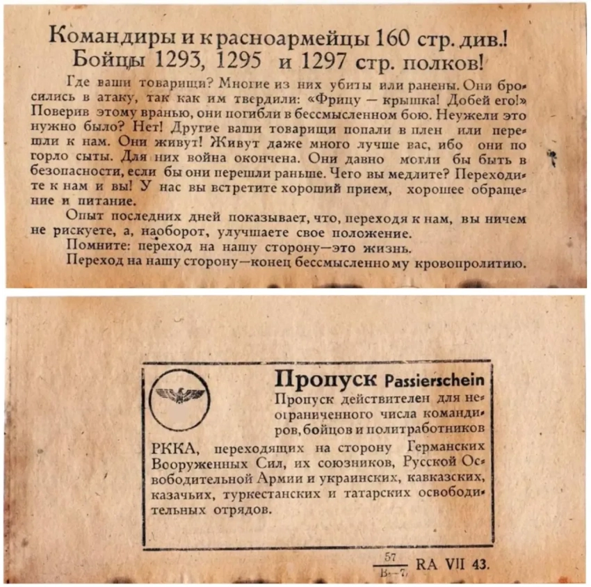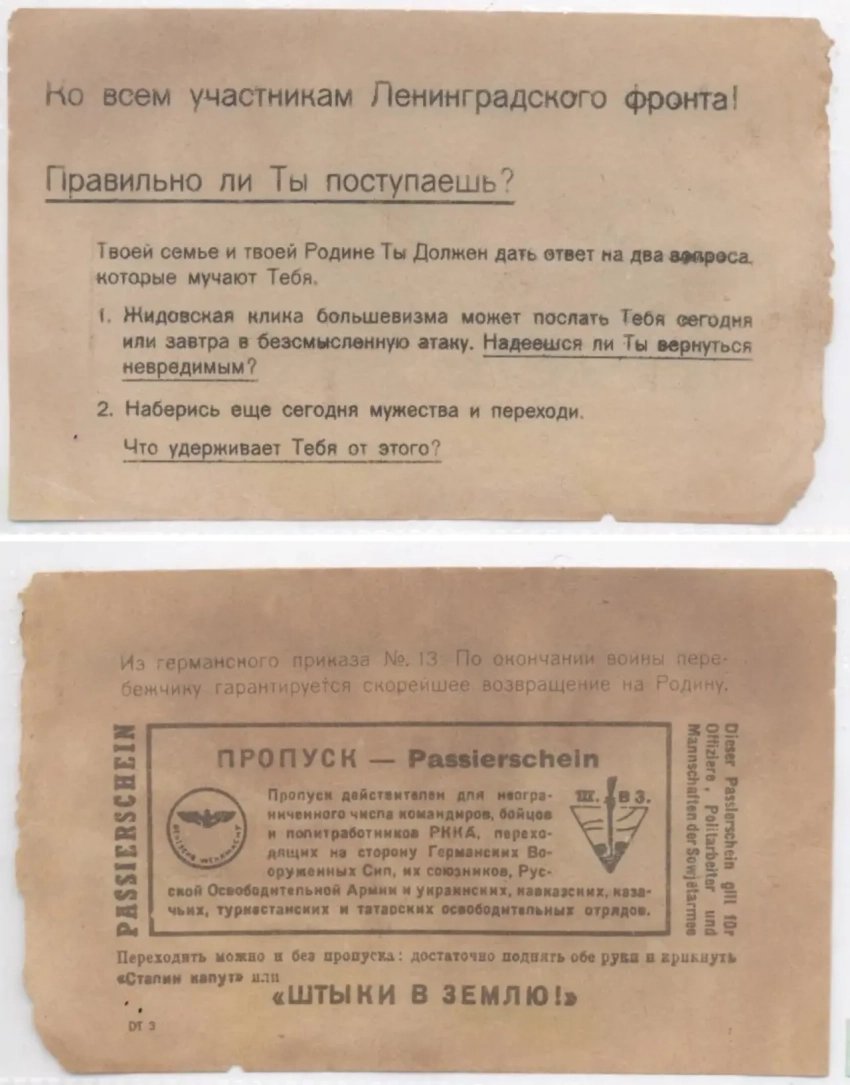 После таких заявлений напрашивалась необходимость дать со своей стороны некую «правдивую» информацию для советских солдат. Для этого периодически выпускались такие листовки, освещающие события в выгодном для немцев свете, или же вообще рассказывающие о событиях, которых не было.