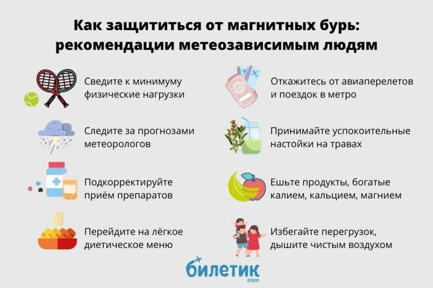 Врач напомнила, что любые бури легче переживаются, если у человека налажен стабильный, физиологичный образ жизни. Она уточнила, что важно нормализовать сон - спать не меньше восьми часов и придерживаться одного режима, отказаться от вредных привычек, сбалансированно питаться, контролировать уровень витаминов и минералов, больше двигаться и чаще бывать на свежем воздухе, ведь всё это поддерживает вегетативные функции и сердечно-сосудистую систему. Также она добавила, что при хронических заболеваниях обязательно нужно наблюдаться у врача, проходить обследования и строго соблюдать назначения: в дни активных бурь именно хронические болезни чаще всего дают о себе знать.