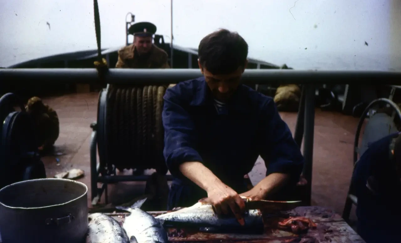 Несколько фотографий такого «размагничивания» сохранилось, выглядит всё довольно забавно — раздел выловленной красной рыбы на икру и тушки на засолку. Экипаж потреблял икру весь поход, и потом уже смотрел на неё как на перловку…