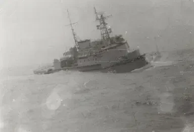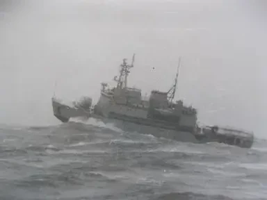 Через несколько часов хода бортом к волне кренометр начал показывать недобрые значения. Сначала было 40, потом 45, и это было уже неприлично… Корабль шёл, расходуя топливо, «всплывал», остойчивость уменьшалась. Ватерлиния была на 1,2–1,5 метра выше уровня воды. Скоро кренометр показал 48, потом 50 градусов. Командиру в каюту с мостика доложили обстановку (он не поднимался на мостик, сидел, запершись в каюте), спросили решение. Ответ был озадачивающий и возмутительный: «Разбирайтесь сами». Старпом обсудил ситуацию с командиром БЧ-5: вариантов для продолжения движения не оставалось — или на якорь, или в управляемый дрейф против волны, пока не утихнет. А вот когда волна утихнет — дело темное… Командование в предложении переждать непогоду отказало, сославшись на приемлемую карту проходящего циклона.
