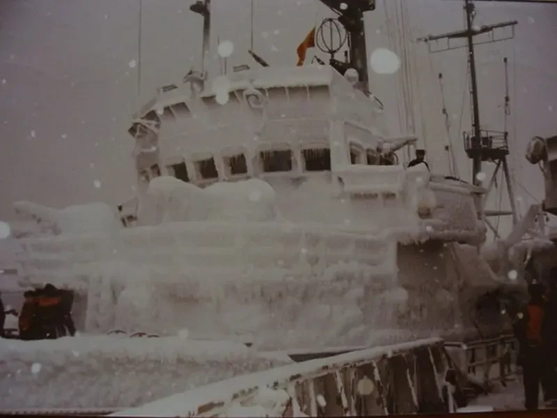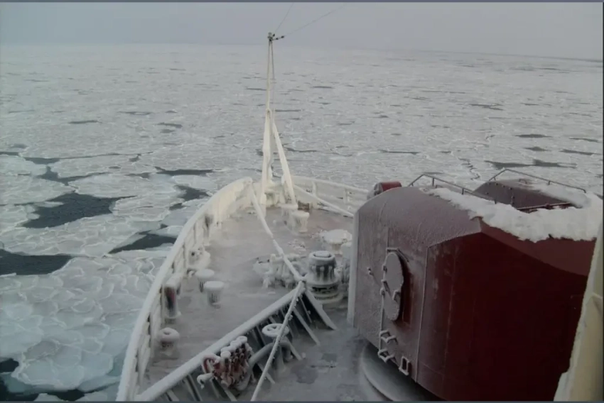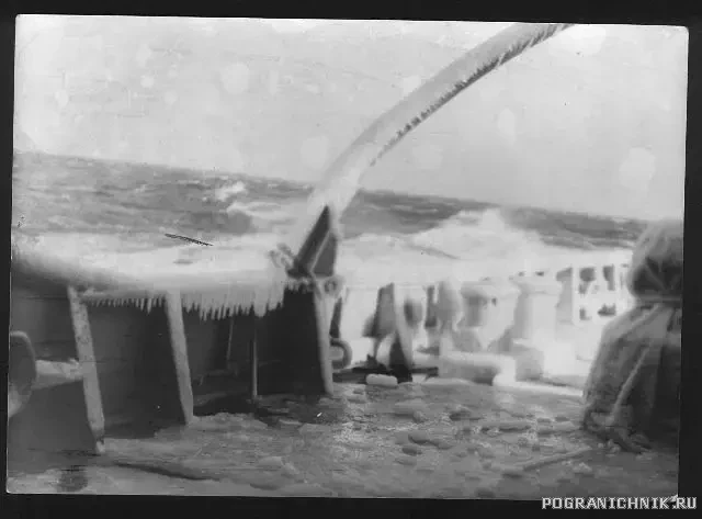 В основном на снимках — ПСКР «Нева», у него сохранился ещё с перехода Северным морским путем «ласточкин хвост» для ледовой проводки в караване, который у других кораблей по прибытии на Камчатку срезали. И очень красноречиво на фото, как он идёт по штормовому океану, а это почти половина всего времени службы… Зимой же корабль в море покрывался толстым слоем льда от мачты до палубы, и при всей красоте — это совсем не романтично в море, так как создавало серьёзный кренящий момент, и на корабле (и не только пр. 97П, но и 745, и других на Камчатке) было специальное расписание по околке льда.