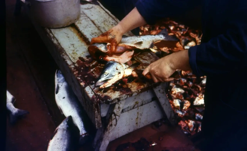 За разделкой командир БЧ-5. Много-много рыбы и икры. Северные Курилы