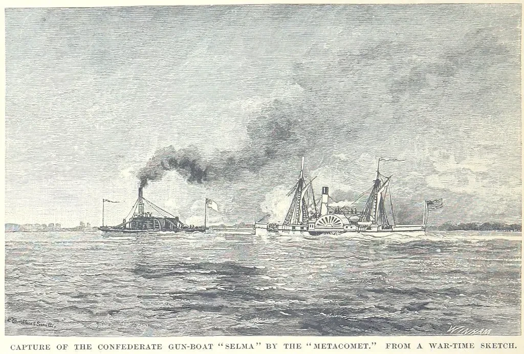 Рассказы по военной истории. Мы завершаем серию материалов о битве северян с южанами в заливе Мобил, ставшей важной вехой на пути к победе федералистов в Гражданской войне. Несмотря на мины («торпеды») и артиллерийский огонь с фортов, северянам удалось прорвать оборону южан. Немедленно после прорыва корабль северян «Метакомет» расцепился с «Хартфордом» и устремился на канонерки Конфедерации. Последние тут же бросились врассыпную, понимая, что их оборона потерпела крах и флот Союза прорвался в залив. В их числе была и канонерка «Селма», устремившаяся вглубь залива. «Метакомет» следовал за ней по пятам, обстреливая из погонных орудий.