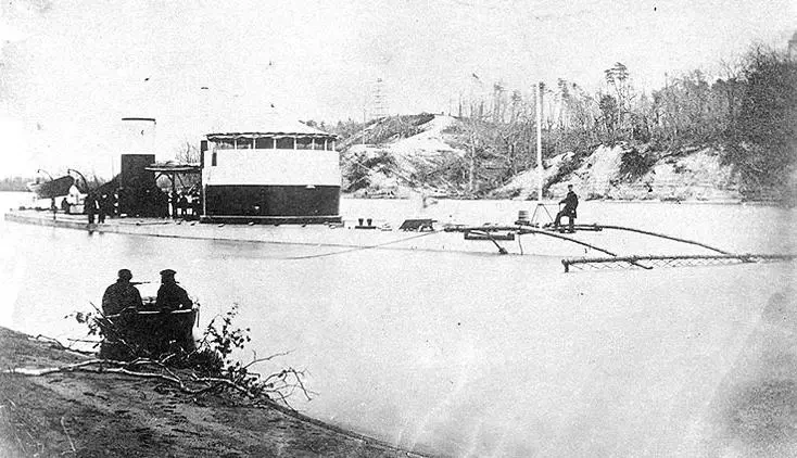 Монитор «Саугус» на реке Джеймс, штат Вирджиния, примерно в начале 1865 года. Обратите внимание на «грабли» для ловли мин