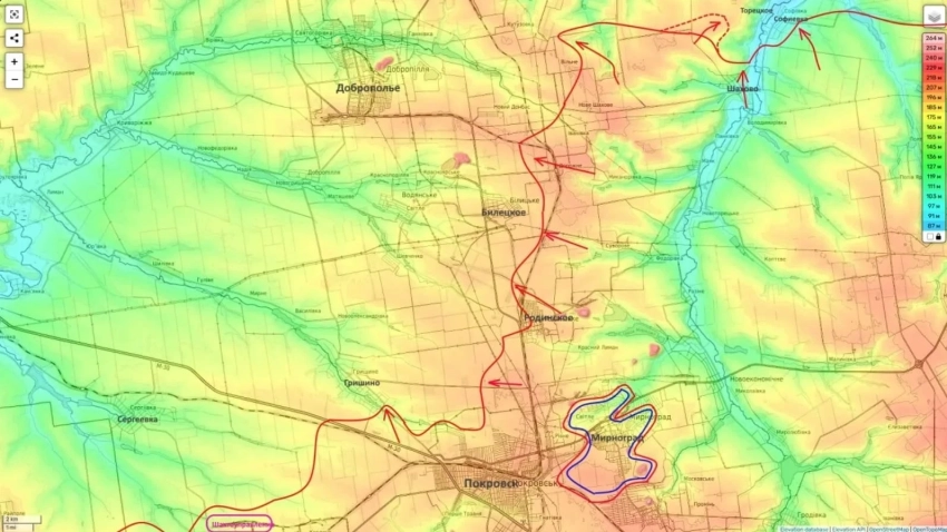 DeepState фиксирует, что под контролем ВСУ остаётся лишь узкая полоса к северу от Мирнограда. Это косвенно подтверждает, что логистика для украинского гарнизона крайне затруднена, даже если формального «котла» пока нет.