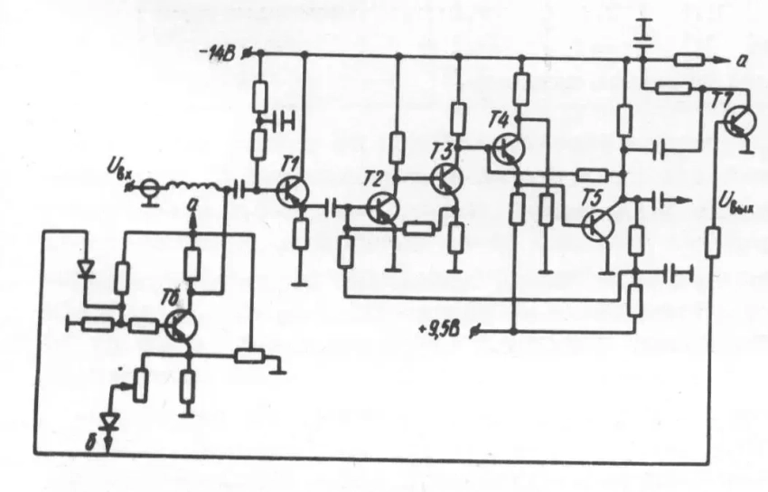 Выходные сигналы усилителя, поступающие на сигнализаторы, снимаются с коллекторной нагрузки транзистора Т6. Транзистор Т7 обеспечивает триггерный режим работы усилителя.