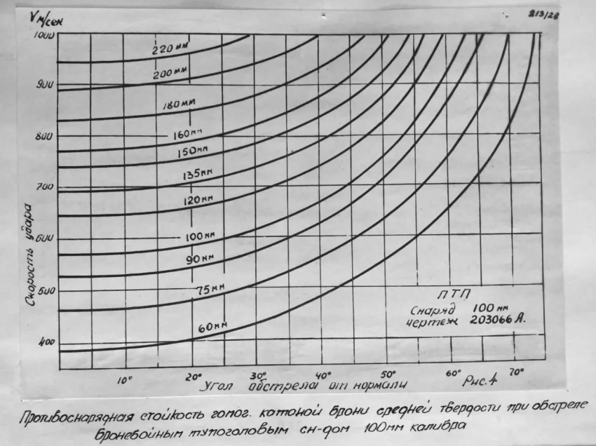 Расчет противоснарядной стойкости в одном случае производился на основании перерасчета коэффициента «К», рассчитанного по бортовой формуле Жакоб-де-Марра для немецкого снаряда 105-мм калибра, на снаряд 128-мм, а в другом случае, на основании сопоставления кривых стойкости отечественной и немецкой брони под огнем одних и тех же немецких снарядов и установленной общей закономерности в характере кривых, кривая стойкости немецкой брони против бронебойных снарядов 128-мм калибра была скорректирована для отечественной брони. Следует отметить, что полученные расчетные значения противоснарядной стойкости по пределу сквозного пробития при сопоставлении в обоих случаях показали достаточно хорошее совладение.
