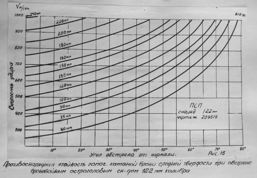 1) Бронепробивное действие немецких и отечественных снарядов крупного калибра (88–152 мм) по гомогенной броне средней твёрдости весьма эффективно лишь при обстреле по нормали или при небольших углах встречи от нее. При этих условиях испытания бронебойные снаряды при скоростях встречи с броней около 1000 м/сек. способны пробить броню толщиной в два с лишним раза превышающей калибр снаряда.