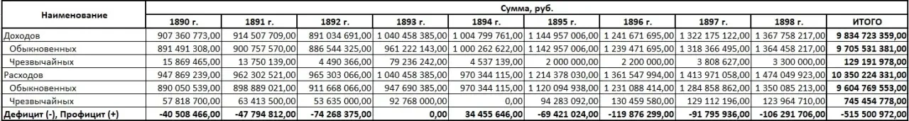 За 9 лет, с 1890 г. по 1898 г., лишь один год был профицитным, а сумма дефицита нарастающим итогом приблизилась к 38% годовой доходной части! Но всё было не настолько плохо.