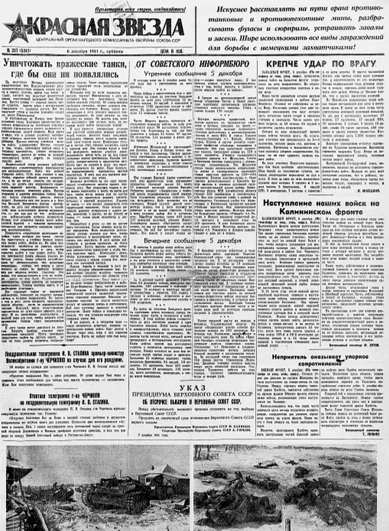 Во второй половине декабря успешно развивалось наступление советских войск правого крыла Западного фронта, которые 19 декабря вышли на рубеж рек Лама и Руза. Левое крыло Западного фронта и Брянский фронт 25 декабря вышли к Оке. Впервые с июня голосом Левитана озвучивались названия освобожденных, а не вынужденно оставленных, все новых населенных пунктов советской земли. Начавшаяся 5-6 декабря 1941 года контрнаступательная операция продлилась до весны 1942-го.