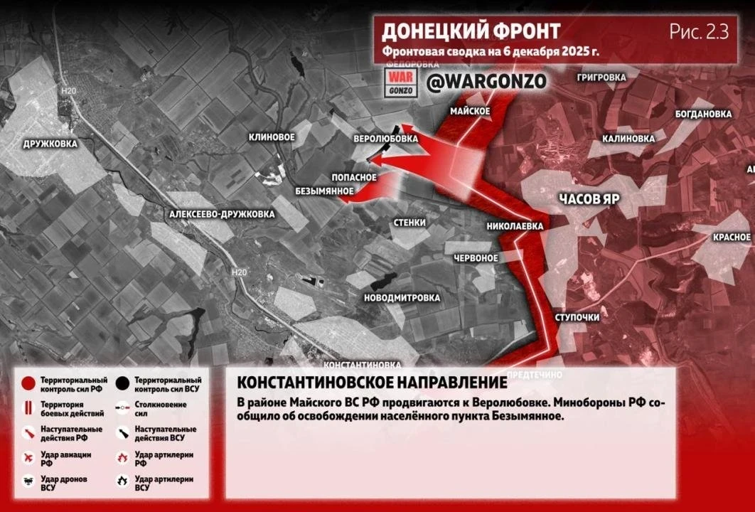 На Константиновском участке фронта российские войска ведут штурмовые действия в направлении Веролюбовки, на юго-восточной окраине Константиновки и вдоль северного берега Клебан-Быкского водохранилища.