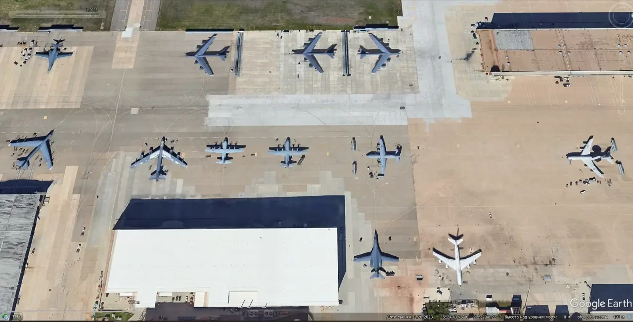 Спутниковый снимок Google Earth: самолёты Lockheed U-2S Dragon Lady на авиабазе Бил