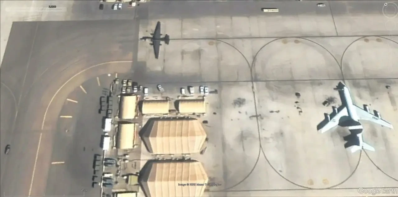 Спутниковый снимок Google Earth: самолёты ДРЛО Boeing E-3G Sentry и военно-транспортные Lockheed C-130Н Hercules на авиабазе Принц Султан