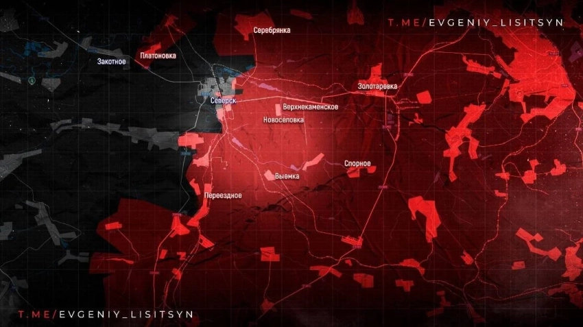 На Краснолиманском направлении ВС РФ ведут бои в районе Дробышево и Яровой. На Северском направлении войска РФ наступают у Озёрного и Платоновки, а также южнее Закотного. В Северске идут ожесточённые бои в северной части города. ВС РФ продвигаются в Свято-Покровском, информирует Telegram-канал Wargonzo.