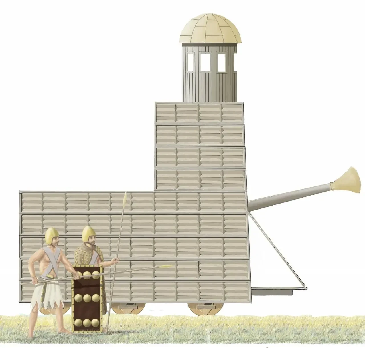 Ну а сам таран представлял собой бревно с плоским металлическим наконечником, которое подвешивалось на веревках к крыше каркаса и раскачивалось наподобие маятника. Почему наконечник был такой странной формы? Скорее всего, потому, что им было удобно бить в стыки между каменными плитами стены и таким образом расшатывать кладку. Ну а башенка явно служила для огневого прикрытия, стрелки из которого должны были прогнать защитников со стены, чтобы они не могли бы мешать работе тарана.