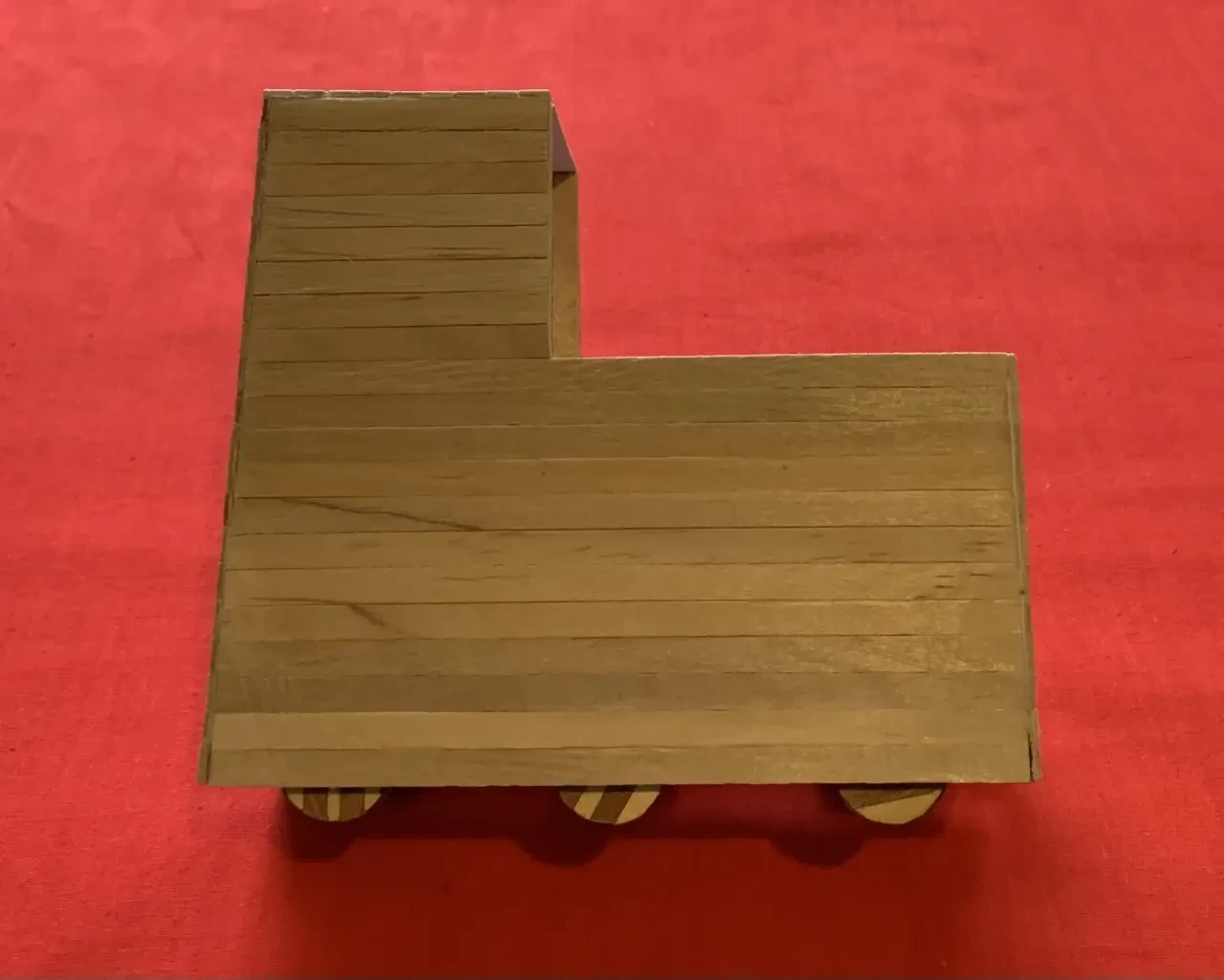 Все основные детали корпуса тарана хорошо видны на нашей фотографии. Фото нужно увеличить, распечатать, бумажные детали вырезать и наклеить на бумагу палочки-мешалочки для кофе, как это мы много раз уже делали. Потом их обрезают по контуру, края зачищают наждачной бумагой, после чего с внутренней стороны по всему их периметру наклеивают «балки» — три палочки, склеенные между собой. Они нужны, чтобы придать нашему изделию необходимую прочность. На верхней площадке нужно прорезать люк для подъема в башенку, а в «нижних балках» просверлить по три отверстия диаметром 3 мм для колесных осей.