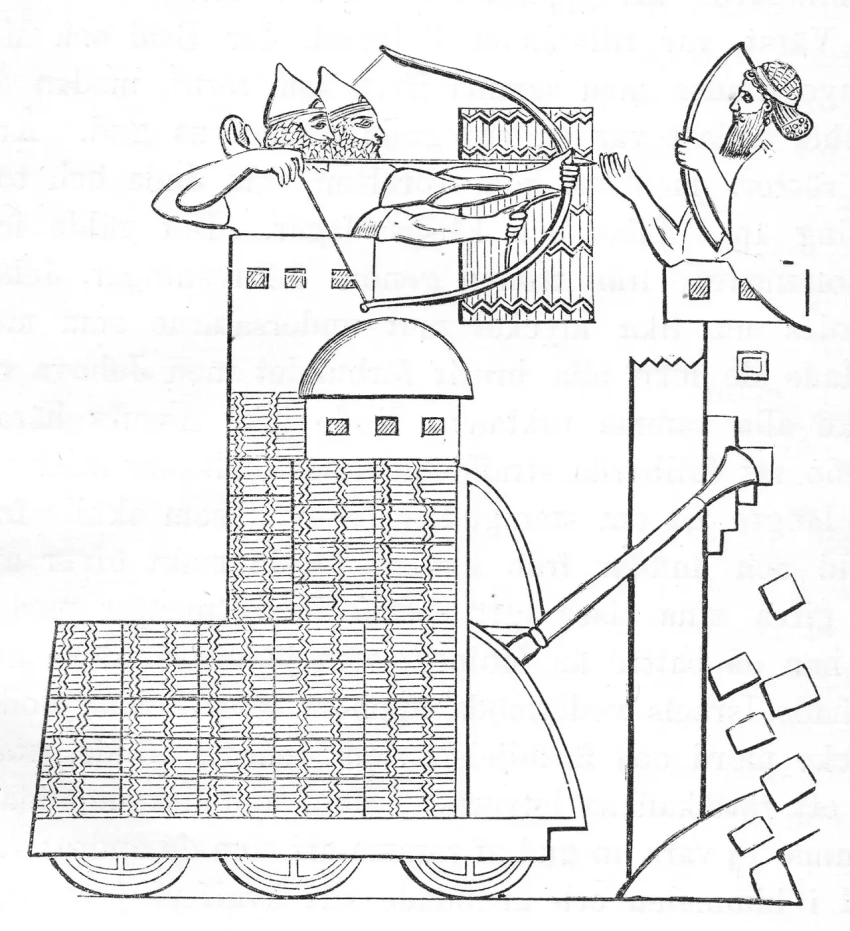 Но интересно, что ассирийские тараны IX века, судя по барельефам из дворца Ашшурнасирпала II (883-859 гг. до н.э.), представляли собой весьма массивные сооружения на шести колесах. Их деревянный каркас имел около 5 м в длину и 2-3 м в высоту. В его передней части располагалась башенка высотой еще около трех метров, которая заканчивалась полусферической крышей или парапетом и имела бойницы для лучников. Для защиты от зажигательных стрел и горящей смолы огня такие тараны покрывались мокрыми шкурами.