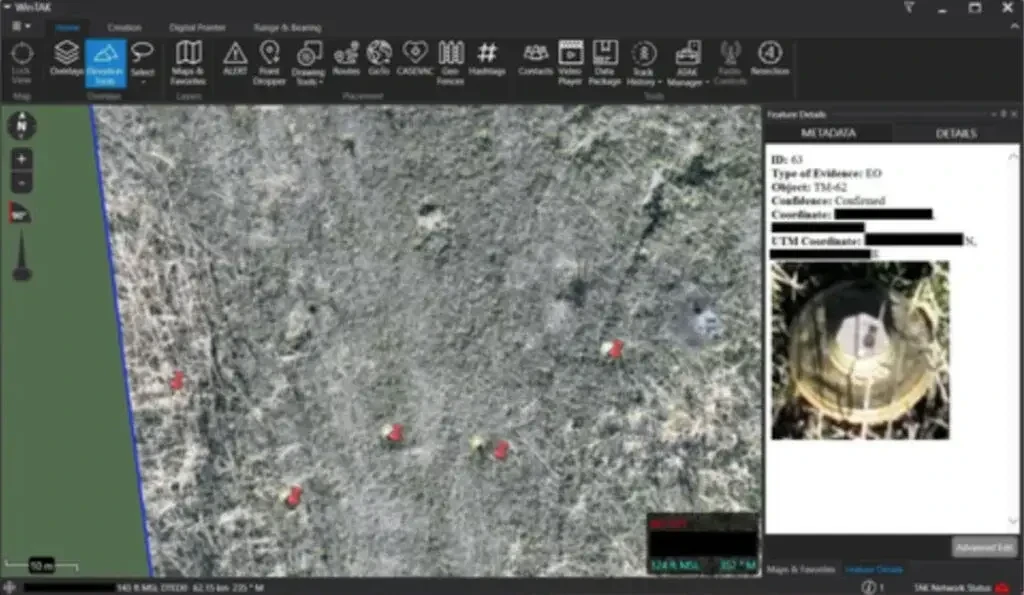 Параллельно автоматика изучает изображения и ищет опасные предметы либо признаки их присутствия. Сообщается, что система SPOTD с высокой точностью определяет мины и иные угрозы, а также рассчитывает их координаты. Опасные предметы наносятся на карту, доступную различным получателям.