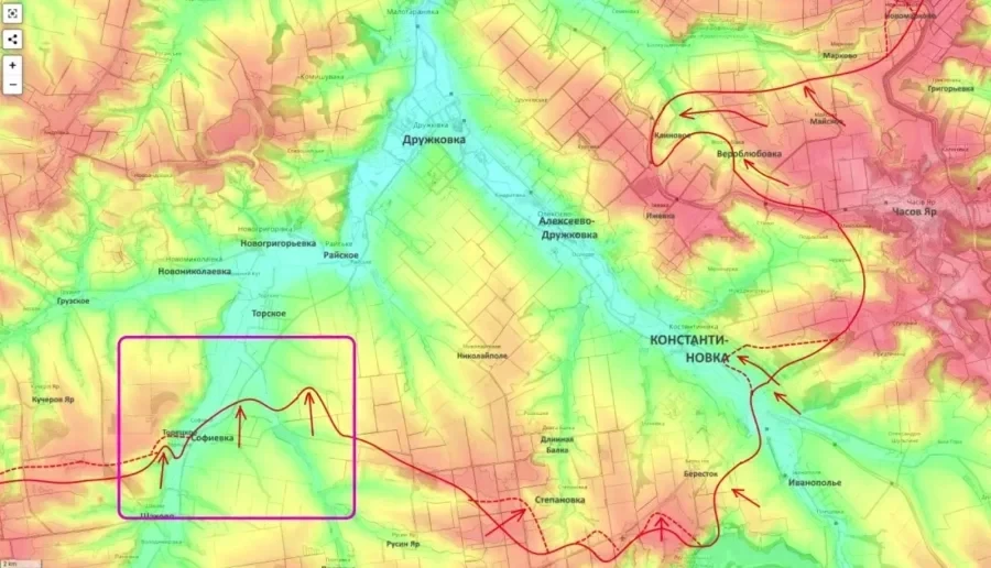 Одновременно развивается наступление вдоль реки Казённый Торец. Занята Софиевка севернее Шахово, подразделения продвигаются к Новониколаевке и Новогригорьевке. Задача на этом участке - охват Константиновки с юго-запада и запада с перспективой выхода к Дружковке совместно с силами группировки «Юг»