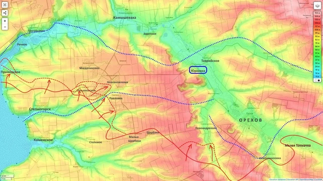 Развитие наступления идет как севернее, так и южнее линии обороны, с общим вектором движения в сторону Юрковки. Закрепление на этом рубеже критически важно для будущей операции по Орехову: контроль над высотами даст преимущество в применении беспилотников и позволит перерезать пути снабжения местной группировки ВСУ, что в перспективе может привести к взятию города и дальнейшему продвижению в направлении Запорожья.