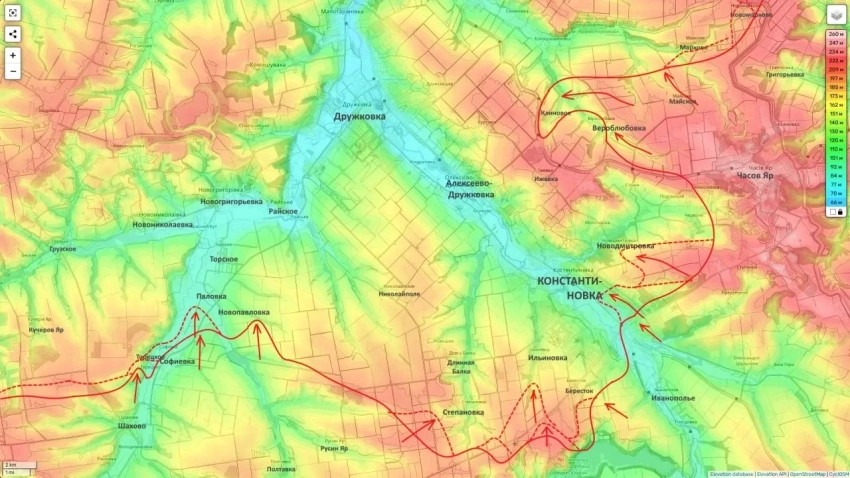 В случае сходящихся ударов в районе улицы Мирошниченко автомобильная дорога Артёмовск-Красноармейск перейдёт под полный контроль российских Вооружённых сил. Пока её участок, проходящий через Константиновку, контролируется силами противника.