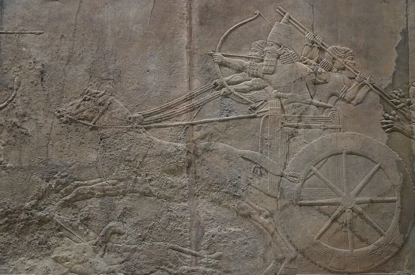 Ассирийские колесницы, запряженные тройкой лошадей, мчатся на врага. Колеса также с шестью спицами, но обода значительно массивнее египетских. На кузове, как и у египтян, видны пеналы для стрел и для лука, также в кузове находится флагшток с эмблемой, копье и щит, усаженный остриями. Музей им. Пушкина, Москва. Фотография автора