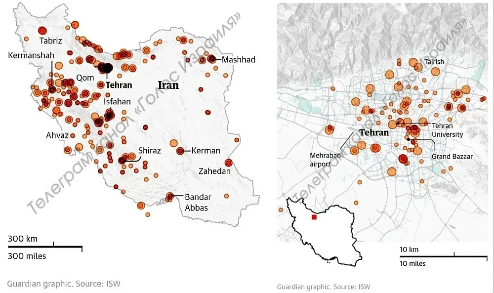В свою очередь, базирующаяся в Иерусалиме частная глобальная вещательная сеть «Голос Израиля» («Коль Исраэль») опубликовала карту протестов в Тегеране и по всей территории Ирана. Ссылаются на данные, полученные, что совсем не удивительно, от британской газеты The Guardian и американского аналитического центра «Институт изучения войны».