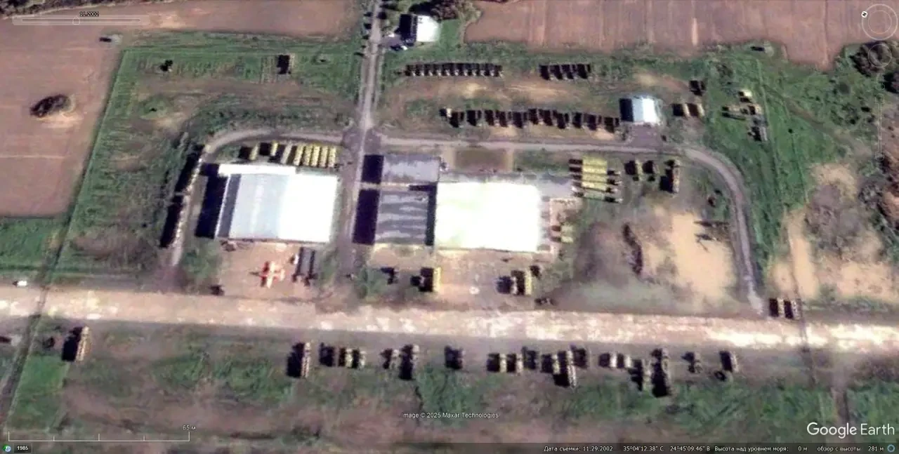 Спутниковый снимок Googlе Еarth: пустая огневая позиция ЗРС С-300ПМУ-1 в 3 км восточней аэродрома Казантзакис. Снимок сделан в феврале 2025 года