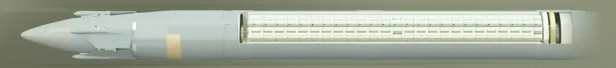 Макет 300-мм ракеты 9М544. Видны сложенные рули и кассетная боевая часть в демонстрационном исполнении. Фото Missilery.info