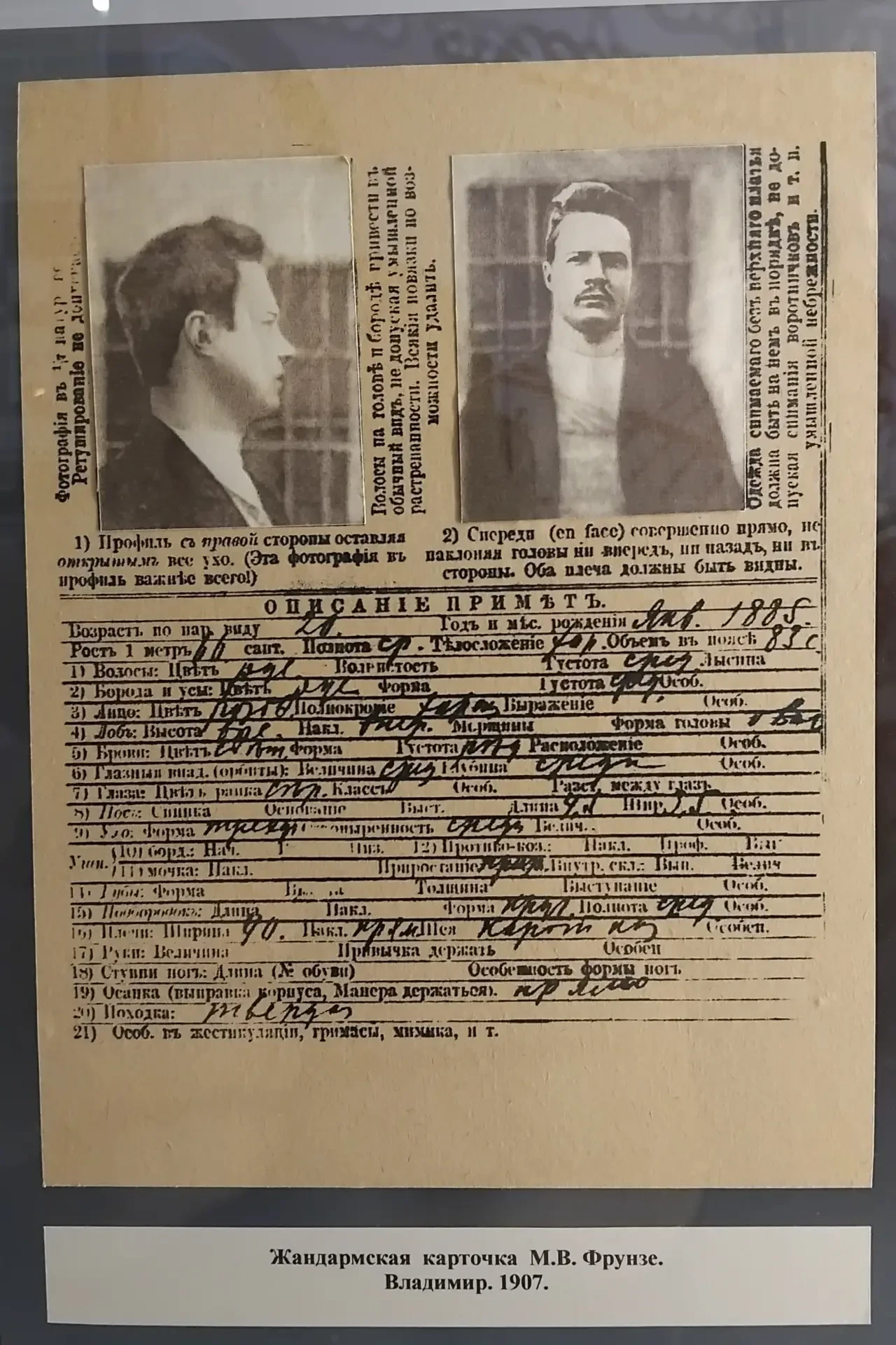 Жандармская карточка Фрунзе с описанием примет, 1907 г., фотография из музея М. Фрунзе в Самаре предоставлена С. Петровым