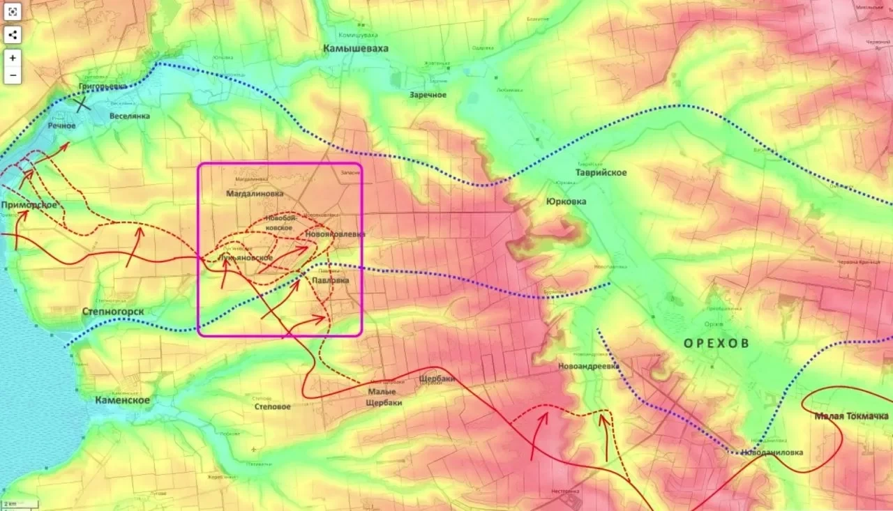 Стратегический замысел здесь читается следующим образом: создание «левой клешни» для глубокого охвата Ореховской группировки ВСУ и