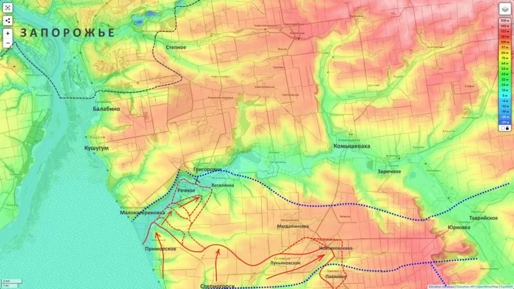 По словам Юрия Подоляка, разрушенная в 2023 году дамба Каховского водохранилища изменила ландшафт региона: пойма реки Конка, поросшая деревьями и кустарником, превратилась в узкий ручей, который уже не способен остановить наступление. Это открывает для российских сил возможности для переправ и угрожает противнику на этом участке.