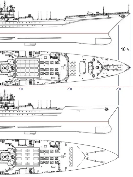 Перестройка носовой оконечности корабля в ходе модернизации позволит компенсировать некоторую весовую перегрузку, возникшую в связи с ростом веса ракетного боекомплекта. Каков ожидаемый результат подобных экзерсисов? Прежде всего, что должно порадовать сторонников москитного флота для РФ, самое наглядное и впечатляющее — это статистическое сокращение максимальной длины корабля с 250,1 метра ровно до 240 метров. Длина по конструктивной ватерлинии остаётся неприкосновенной. Менее впечатляющим, но не менее важным будет уменьшение высоты носовой части с 16 до 13 метров, теперь корпус по горизонтали будет разделён на четыре отсека вместо пяти.