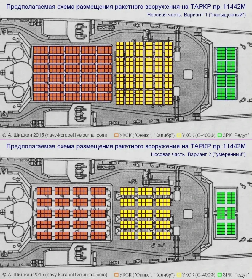 По факту модернизации ТАРК «Адмирал Нахимов» в объёме, который занимали 20 ПУ и 20 ракет «Гранит», теперь размещены 10 ВПУ УКСК 3С14 и 80 ракет различного назначения в транспортно-пусковых стаканах. Вес нового боекомплекта в том же объёме ориентировочно можно оценить в 256 тонн. Вплоть до начала модернизации рассматривались различные предложения и варианты количества пусковых установок ударного вооружения крейсера.