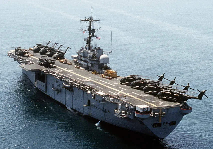 Водоизмещение 11 000 тонн. Сплошная полетная палуба протяженностью 180 м. Дюжина транспортных вертолетов. Возможность принять на борт 2000 морских пехотинцев.