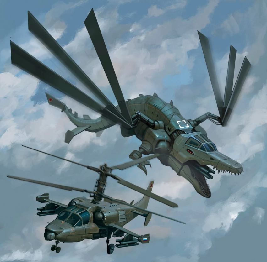 Изображение ударного вертолета Ка-52 получило черты аллигатора, отражая его способность плотно схватить и «пережевать» вражескую технику, так же как аллигатор делает это с добычей. Тяжелая огнеметная система «Солнцепек» была превращена в огнедышащего дракона, символизируя его возможность выжигать позиции противника.