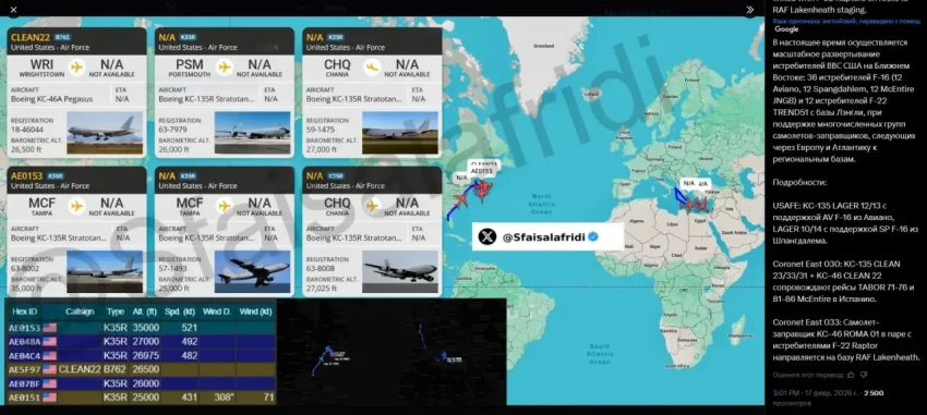 Большая группа самолетов американских ВВС направляется на Ближний Восток, чтобы усилить уже находящиеся там силы, пока президент США Дональд Трамп рассматривает возможность нападения на Иран. Онлайн-трекеры показывают, что истребители F-22 «Раптор», истребители F-16 «Файтинг Фалкон», радиолокационные самолёты E-3 «Сентри» и самолёт-разведчик U-2 «Дракон Леди» (господи, даже этого ветерана припахали!) либо пересекают Атлантику, либо только что прибыли в Европу. Кроме того, седьмой эскадренный миноносец с управляемым ракетным оружием типа «Арли Бёрк», «Пинкни», недавно был направлен в зону ответственности Центрального командования США.