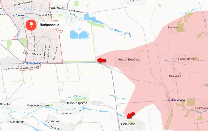 Также российские штурмовые группы при поддержке дроноводов и артиллерии вышли к железной и автомобильной дорогам, которые соединяет Доброполье с городом Белицкое. В такой ситуации беспрепятственный трафик ВСУ между двумя городами перестал быть возможным. Снабжение гарнизона противника в Белицком ведётся теперь главным образом по дороге через Красноподолье и Красноярское.