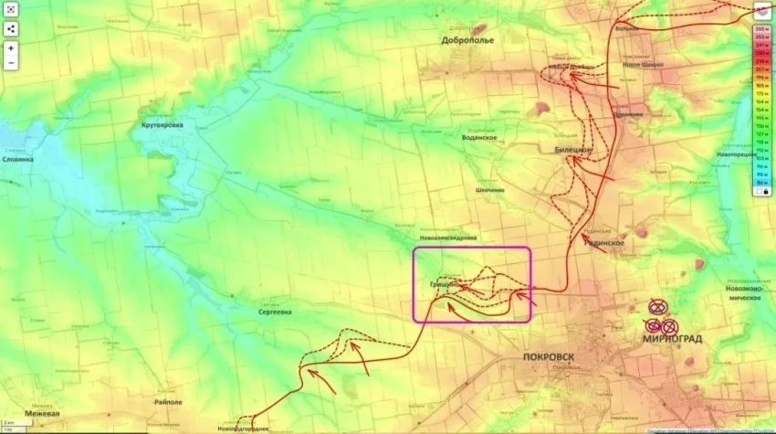Однако наиболее серьезные события разворачиваются севернее - в районе Покровска, Мирнограда и Белицкого. Российские войска местами уверенно прорывают оборону ВСУ. За населённый пункт Гришино идут крайне ожесточенные схватки: половину села уже контролируют ВС РФ, остальная часть превратилась в огромную серую зону.