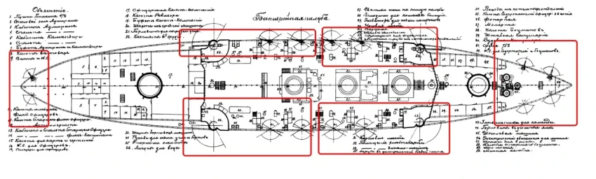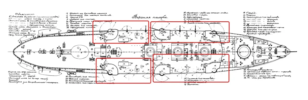 Что же до верхней палубы, то на ней располагалось четыре плутонга. Но, поскольку 6-дм орудий на данной палубе было шесть, то средние шестидюймовки включены были в состав носовых плутонгов, которые состояли, тем самым, из двух 6-дм и двух 75-мм орудий. Кормовые плутонги соответствовали таковым на батарейной палубе.