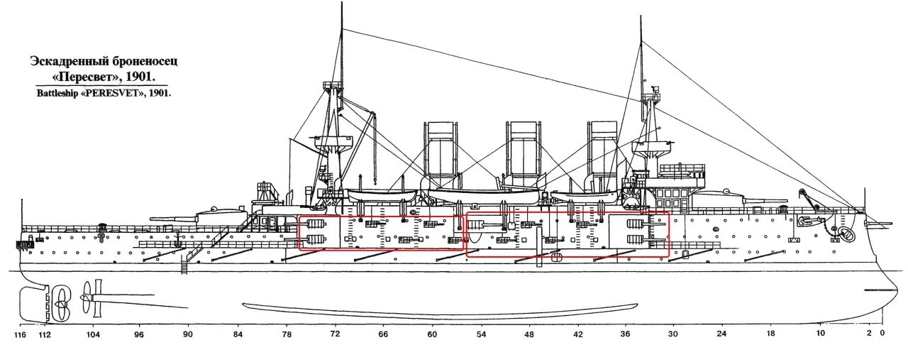 Что до пушек калибра 75-мм и ниже на навесной палубе, то они делились на 4 плутонга. В правый носовой входили 75-мм пушка над носовым казематом, две 47-мм пушки, размещенные одна на мостике, вторая над средним казематом, и две 37-мм пушки. Правый кормовой – 75-мм пушка над кормовым казематом, две 47-мм пушки на заднем мостике и на площадке около кормовой боевой рубки и одна 37-мм пушка.